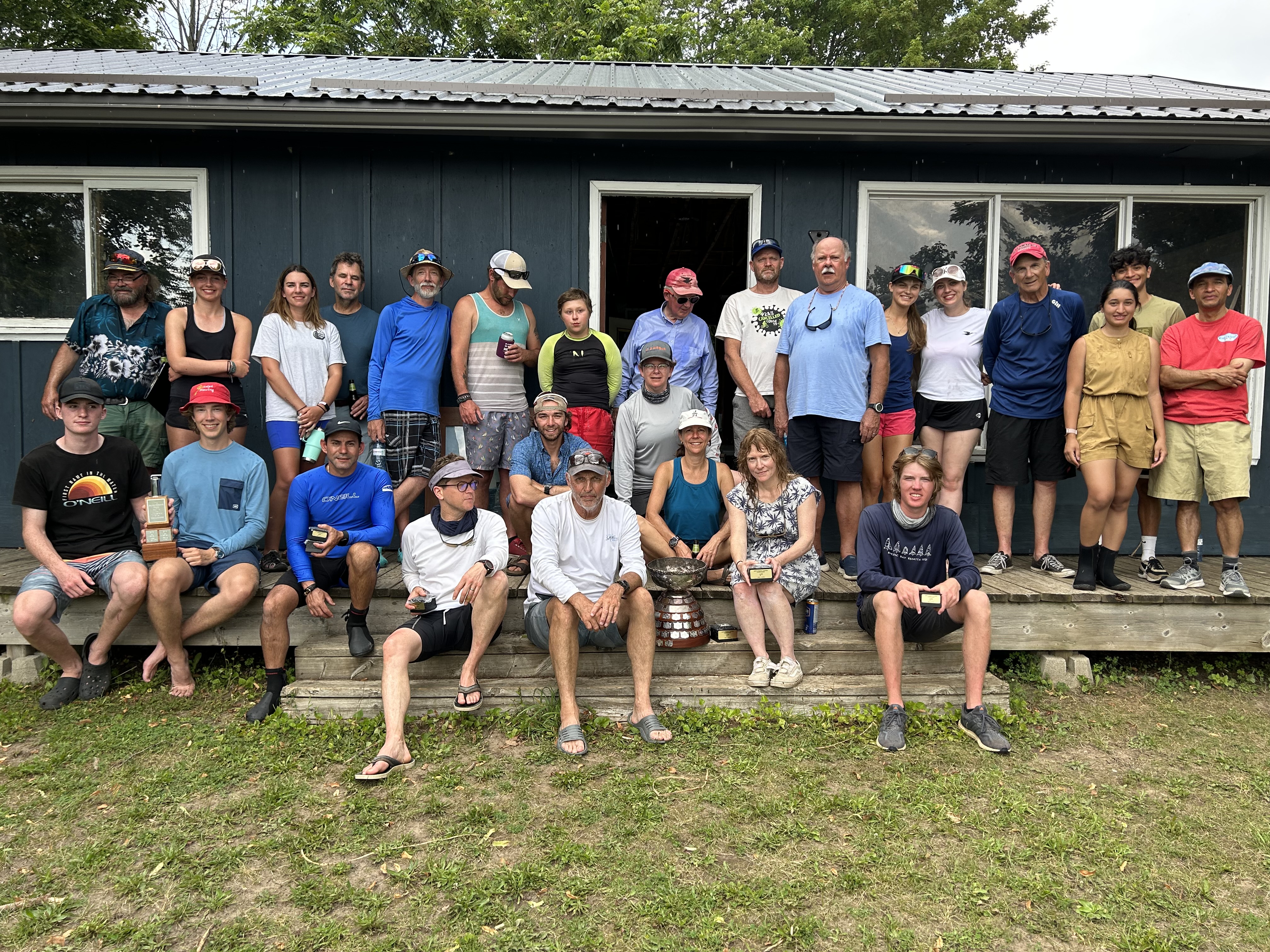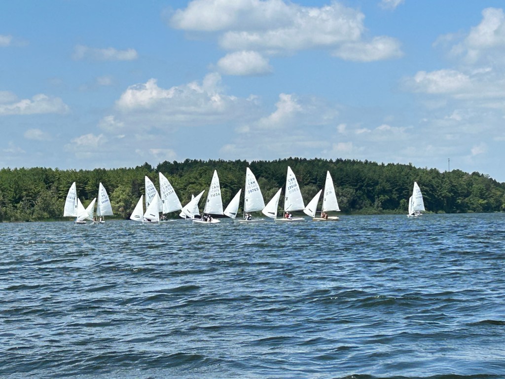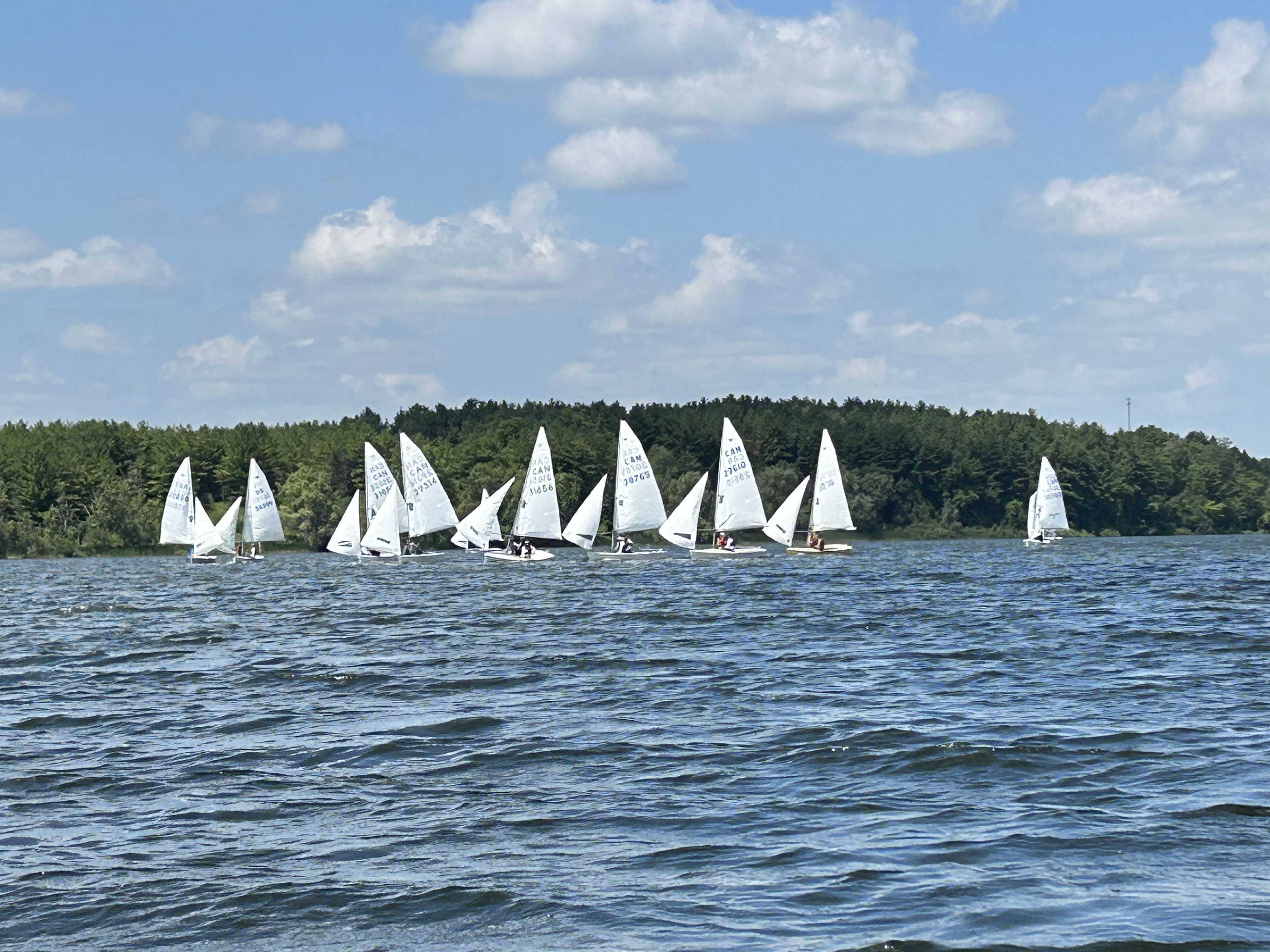 On Day One, the wind direction (and shiftiness) combined with a shrinking lake made it a challenge for PRO Dave Sprague to find a wide enough spot to set a course, but he managed to find just the right spot. The light breeze held through the day, and after eight races, defending champion Harri Palm was in the lead with former Canadian Champion Chris Hains close behind. After blowing out a halyard in the 5th race. Julian and Oliver Inglis finished the day strong with three consecutive wins. Edging them up into third place.